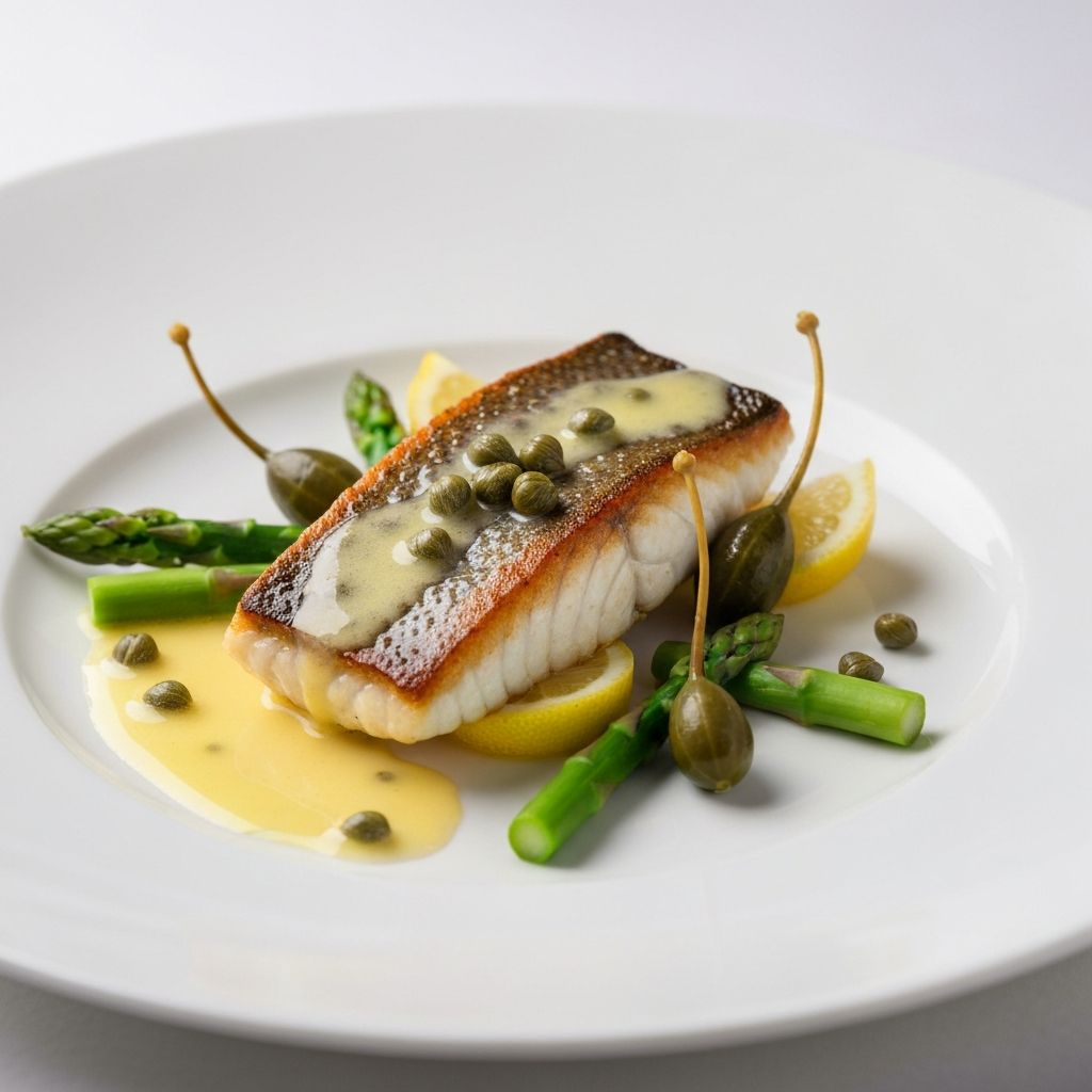 Line-caught sea bass with lemon beurre blanc, capers and asparagus.
